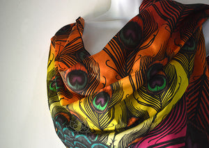 Our Original illustration Sunrise Peacock Feather Fan patterned printed scarf, designed by our illustrator/designer Mary.