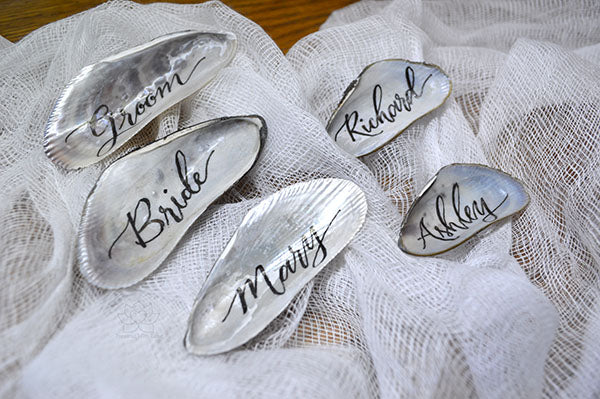 Calligraphy Mussel Shell & Mini Bottle Name Place Cards Featured on Emmaline Bride!