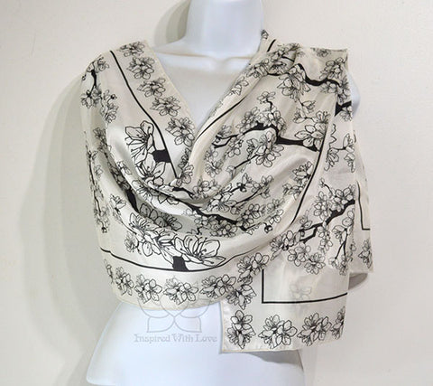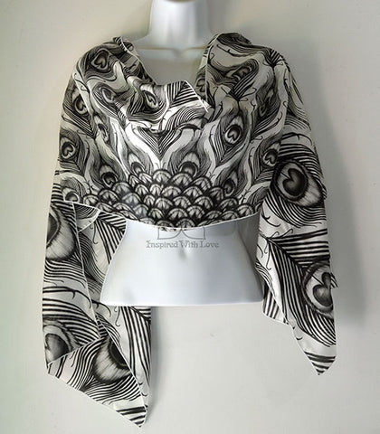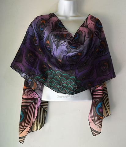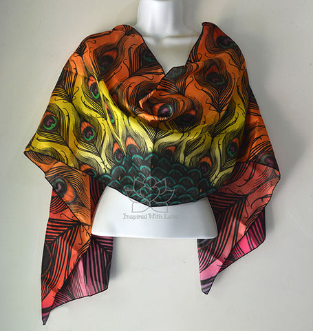 Our original illustrated pattern designs are created by Inspired With Love. Our patterns are permanently printed directly onto the scarf and the pattern is visible on both sides. They are washable and made to last. You have an option between your preferred scarf size & either 100% Silk Habotai or Poly Chiffon fabric blend. All of the scarves' edges are baby rolled machine finished hemmed edges.