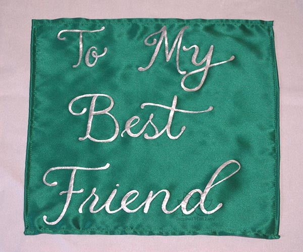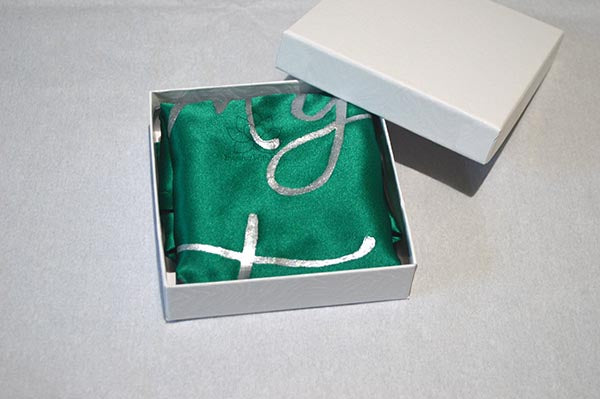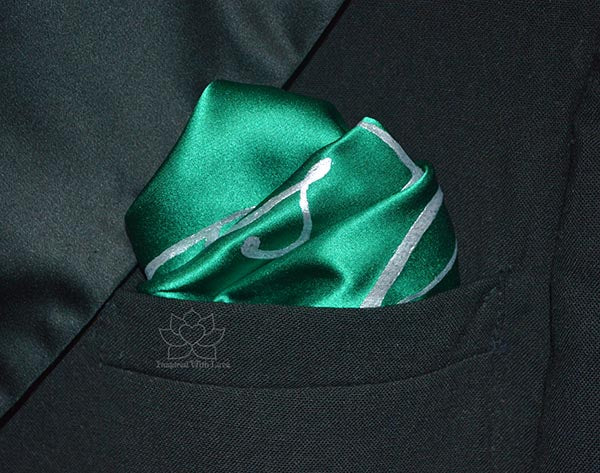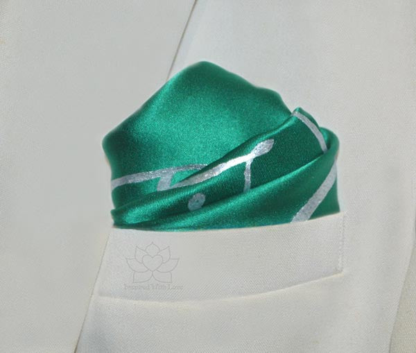 **As Shown: Forest Green 100% Silk (Charmeuse) pocket square with Metallic Silver script