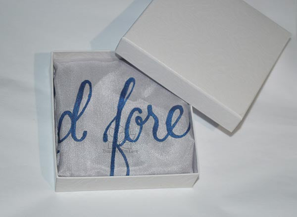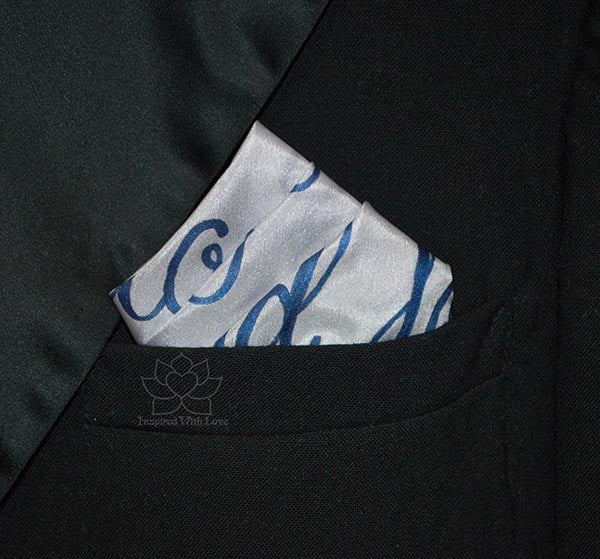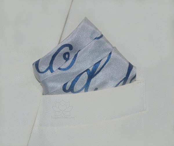**As Shown: Silver 100% Silk (Habotai) pocket square with Shimmery Navy script