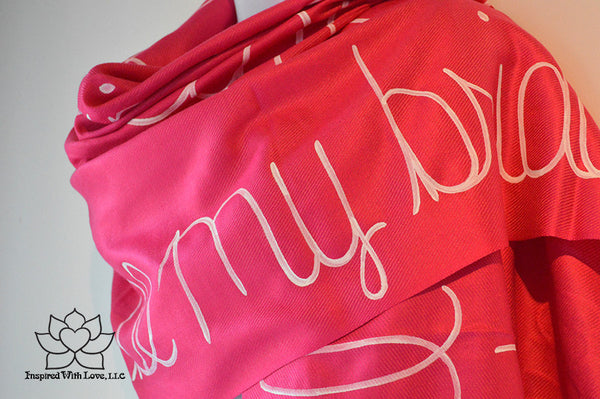 A great personalized gift for someone special for occasion: Bridesmaid Proposal, Gifts for her, Gifts for mom, Mother's Day, Memory scarf, Book Literary scarf, Friendship shawl, Anniversary gift! A unique custom hand-painted message or quote on soft pashmina-style scarf, exclusively created by Inspired With Love. It contain a hidden message on the inside, and looks like an abstract pattern when worn. It's completely customizable.