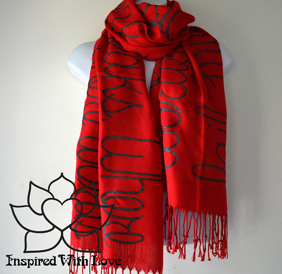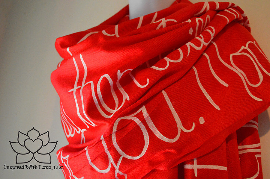 Custom personalized hand-painted pashmina script Red scarf. Completely customizable. Choose your favorite quote, message, phrase. Contain a hidden secret message on the inside and looks like an abstract pattern when worn. Exclusively created by Inspired With Love.