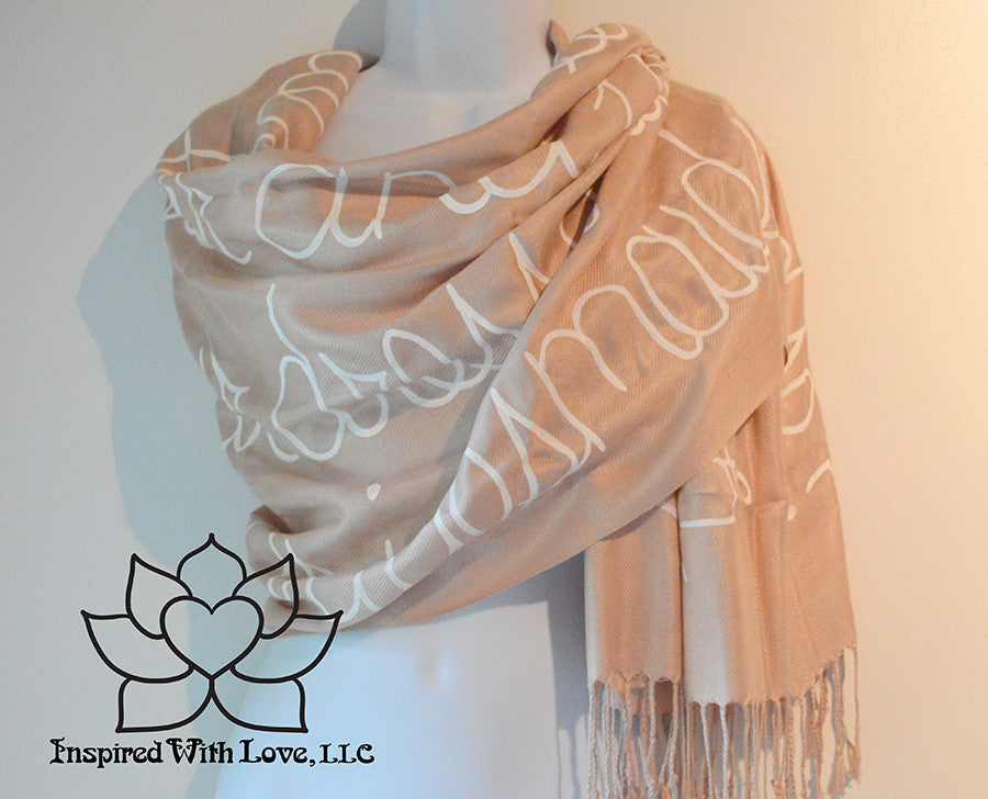**Please note: These are hand-painted script on pashmina scarf. Each individual scarves are unique and may not look exactly like the photo. Please allow approximately 1-2 weeks prior to shipping as these are custom make, but we typically ship between 1-4 business days. If you need it by a certain date (sooner than 2 weeks), please include the date in the note. All scarves will be shipped via USPS Priority Service.