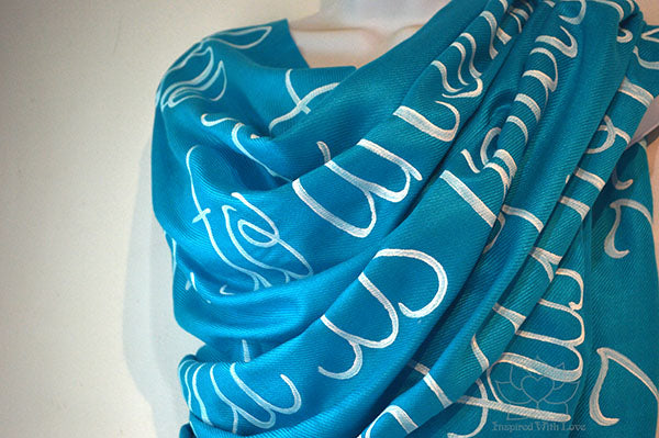 (pic 1-6) Turquoise shawl with White script