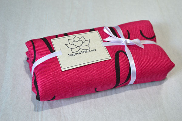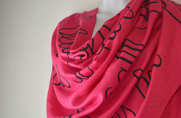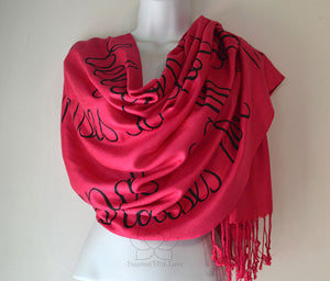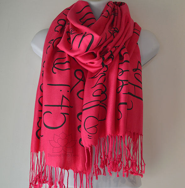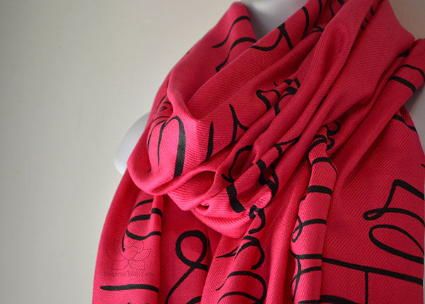 **scarf in pictures as shown: Fuchsia scarf with black script:
