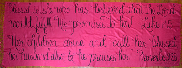 Custom Christian Bible scripture scarf gift with 2 scriptures: Proverbs 31:28 - Her children arise & call her blessed, Luke 1:45 - Blessed is she who has believed that the Lord would fulfill His promises to her! They makes a great prayer shawl gifts, Christian scripture scarf accessories gifts for her, spiritual meditation scarf, Inspirational gifts for her, mom, grandma, Teacher Retirement & Appreciation, back to school students, graduating students, uplifting words of hope for cancer patients survivor, or simply for anyone who would enjoy this gorgeous scarf! They contain a hidden secret message (with your choice of quote, message, phrase, bible scripture, or words that speaks to your heart) on the inside but have an abstract appearance when worn. All of our personalized custom script scarves are hand-painted with a permanent textile paint in Inspired With Love studio in Savannah, Georgia. They are completely customizable, you choose your scarf colors, script colors, and words.