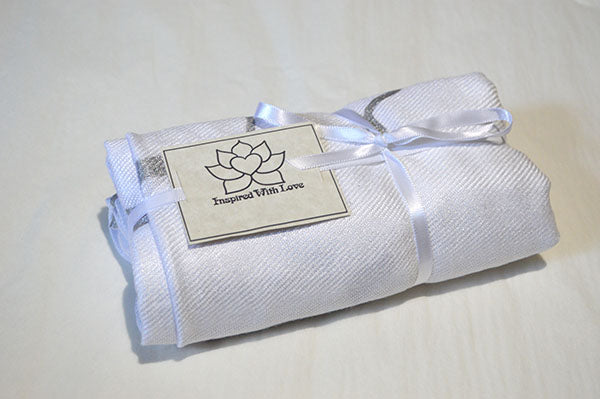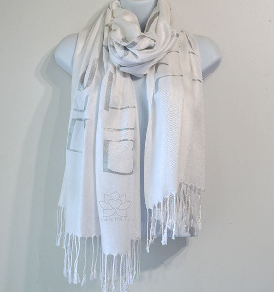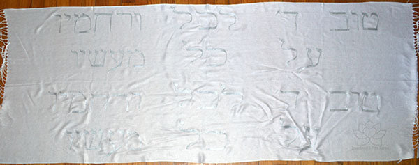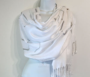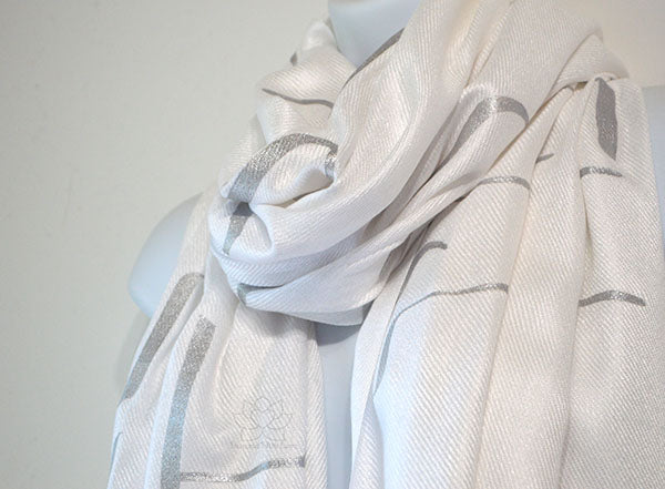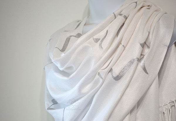 **scarf in pictures as shown: White shawl with Metallic Silver script (hand-painted in Hebrew)