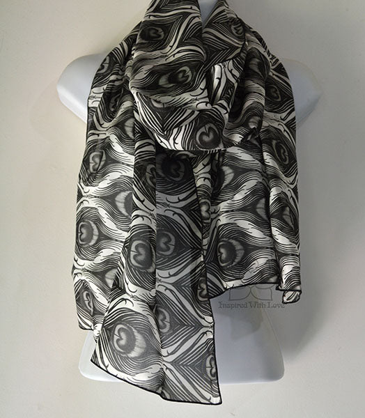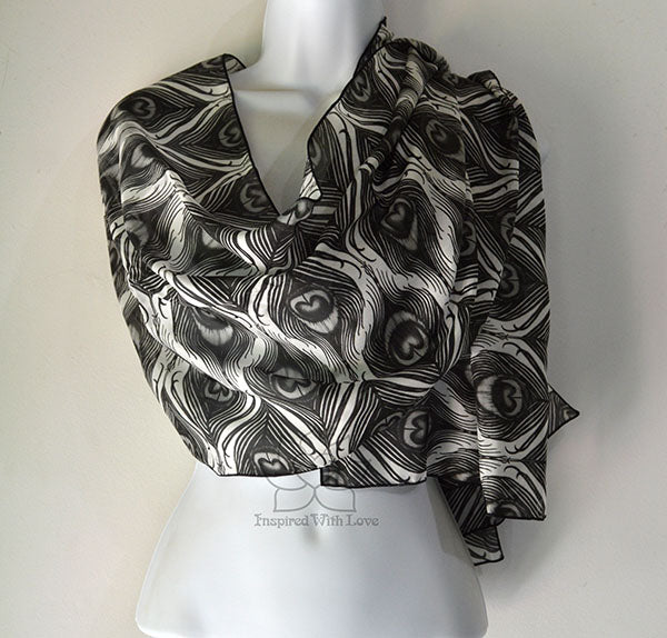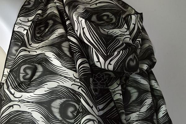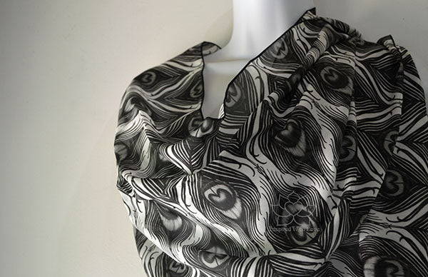 Our Original Peacock Feather pattern in Black & White Monotone color is originally designed & illustrated by our illustrator Mary at Inspired With Love. Our patterns are permanently printed directly onto the scarf and the pattern is visible on both sides. They are washable and made to last. You have an option between your preferred scarf size & either 100% Silk Habotai or Poly Chiffon fabric blend. All of the scarves' edges are baby rolled machine finished hemmed edges.