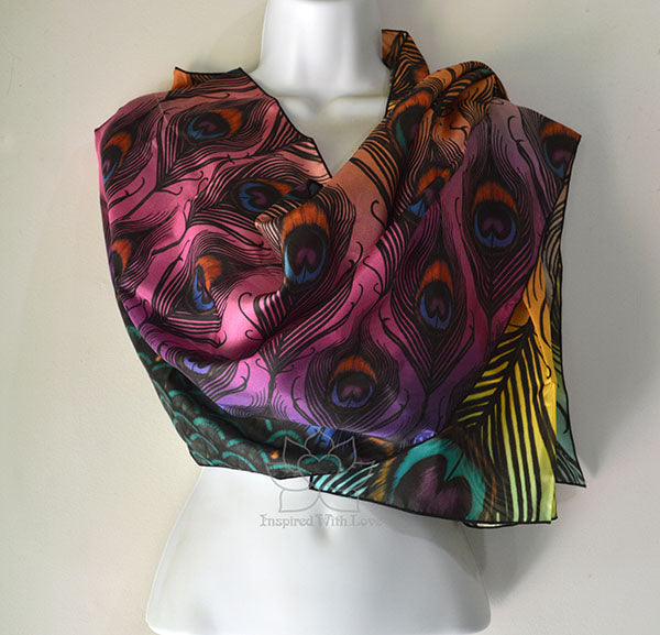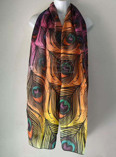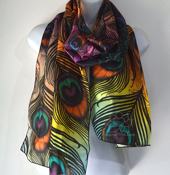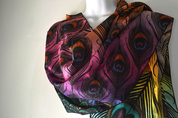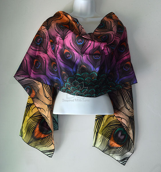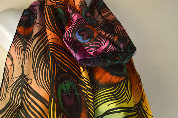 Our Original Peacock Feather Fan pattern in Sunrise color is originally designed & illustrated by our illustrator Mary at Inspired With Love. Our patterns are permanently printed directly onto the scarf and the pattern is visible on both sides. They are washable and made to last. You have an option between your preferred scarf size & either 100% Silk Habotai or Poly Chiffon fabric blend. All of the scarves' edges are baby rolled machine finished hemmed edges.